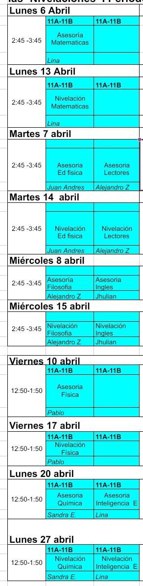 Cordial saludo, les dejo el horario de asesorías y nivelaciones 1er periodo.