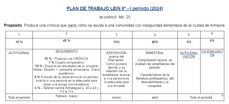 Adjunto el plan de trabajo con el cual se evaluarán las enseñanzas adquiridas durante este 1er periodo, quien desee lo puede IMPRIMIR y pegar en su cuaderno.