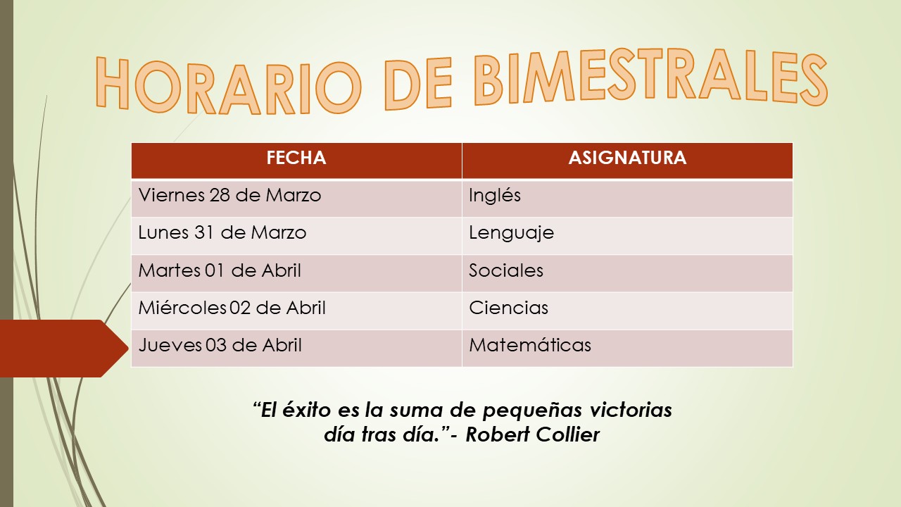Cordial saludo, por medio del siguiente mensaje comparto las fechas en que se van a realizar los bimestrales por medio de una imágen adjuntada a continuación. Gracias por la atención prestada.