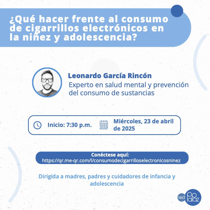 Buen día estudiantes y padres de familia. Aquí les publico el link para entrar hoy a la charla sobre estrategias para disminuir el uso de vapeadores. Recuerden que deben realizar una infografía en un octavo de cartulina con lo aprendido durante la charla. La infografía debe ser presentada el próximo viernes 2 de mayo.