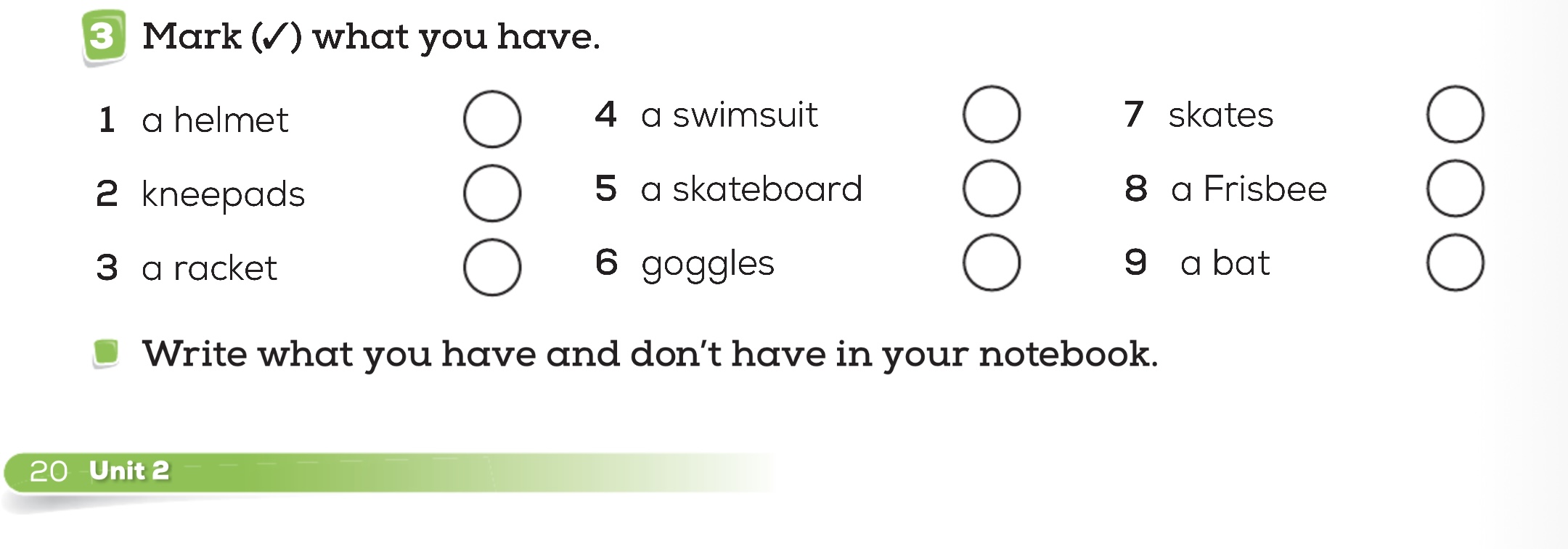 Consiste en escribir en el cuaderno oraciones usando have o don't have con el vocabulario que encuentran en el libro, pagina 20.