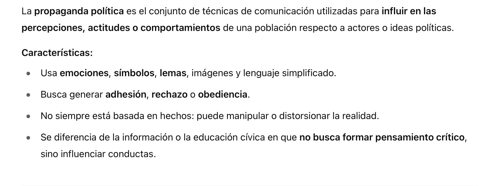 | Apelación emocional (patos) | Recurso que busca tocar emociones como el miedo, esperanza o patriotismo. | - Busca movilizar al público- Muy poderosa en campañas- Se apoya en imágenes o lenguaje emotivo | "Por tus hijos, por tu futuro, vota por el cambio." |
