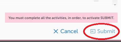 No olviden cuando finalicen todas las actividades y la franja roja( You must complete all the activities, in order. to activitate SUBMIT) se vuelva amarilla darle SUBMIT, para que la entrega se efectue