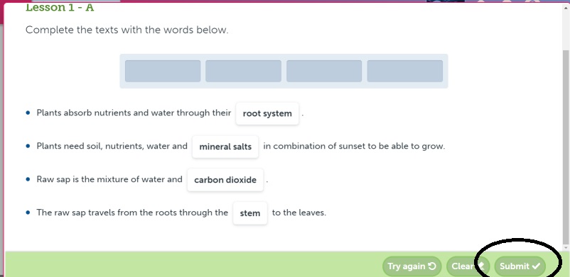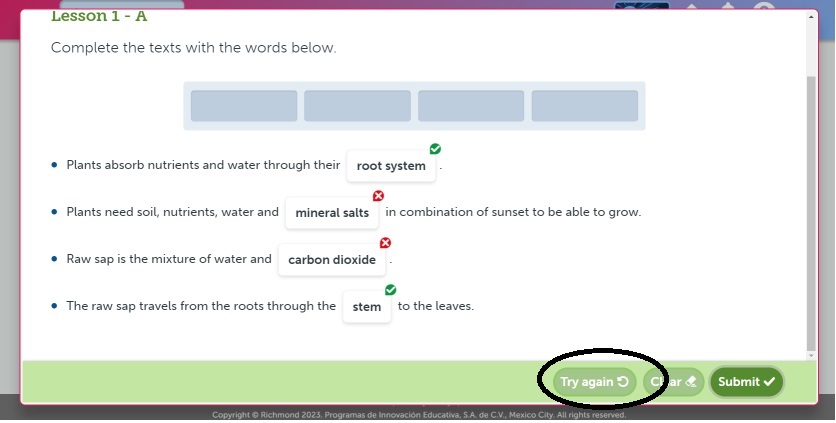 Paso 7: Este es un ejemplo de los ejercicios, se debe completar y despues le damos click en SUBMIT. Si nos equivocamos tenemos una nueva oportunidad y de damos en TRY AGAIN. Y luego nuevemente SUMBMIT