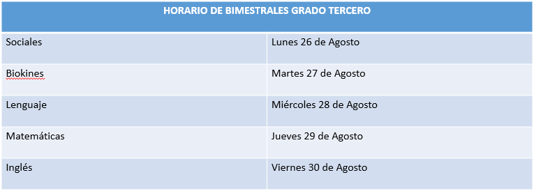 A continuación adjunto el horario para los bimestrales de grado tercero. Muchas gracias y quedo atenta a cualquier inquietud.